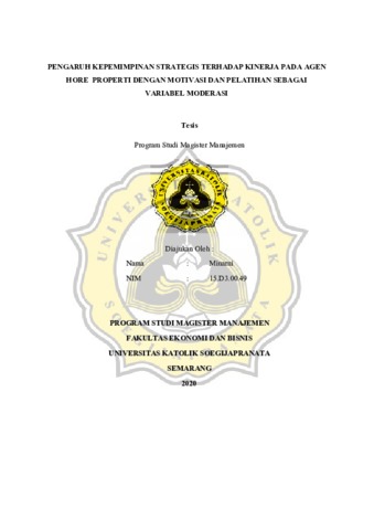 Minarni, - (2020) PENGARUH KEPEMIMPINAN STRATEGIS TERHADAP KINERJA PADA AGEN HORE PROPERTI DENGAN MOTIVASI DAN PELATIHAN SEBAGAI VARIABEL MODERASI. Masters thesis, Unika Soegijapranata Semarang.