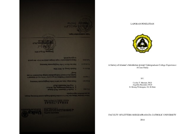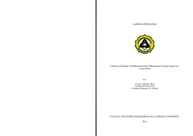 MURNIATI, CECILIA TITIEK and RIYANDARI, ANGELIKA and Wohangara, B. Retang (2014) A Survey of Alumni's Satisfication toward Undegraduate Collage Experience : A case study. Other. UNIKA Soegijapranata, Semarang. (Unpublished)