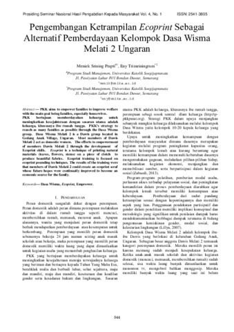 PKK aims to empower families to improve welfare with the main goal being families, especially housewives. PKK bertujuan memberdayakan keluarga untuk meningkatkan kesejahteraan dengan sasaran utama adalah keluarga, khususnya ibu rumah tangga. PKK’s strategy to reasch as many families as possible through the Dasa Wisma group. Dasa Wisma Melati 2 is a Dawis group located in Gedang Anak Village, Ungaran. Most members of Dawis Melati 2 act as domestic women. The efforts to empowerment of members Dawis Melati 2 through the development of Ecoprint skills. Ecoprint is a technique of printing natural materials (leaves, flowers, stems) on a piece of clotch to produce beautiful fabrics. Ecoprint training is focused on ecoprint pounding techniques. The results of the training were that members of Dawis Melati 2 could create an ecoprint scraf whose future hopes were continually improved to become an economic source for the family.