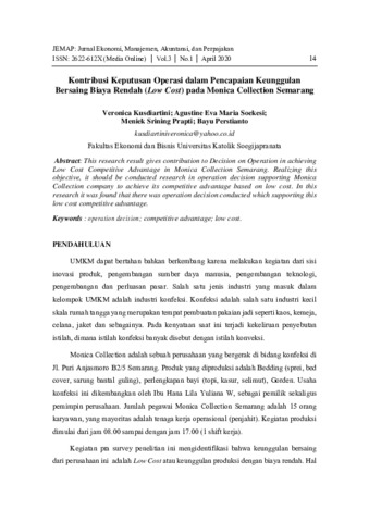 KUSDIARTINI, VERONICA and SOEKESI, AGUSTINE EVA MARIA and PRAPTI, MENIEK SRINING and PRESTYANTO, BAYU KONTRIBUSI KEPUTUSAN OPERASI DALAM PENCAPAIAN KEUNGGULAN BERSAING BIAYA RENDAH (LOW COST) PADA MONICA COLLECTION SEMARANG. JEMAP Jurnal Ekonomi, Manajemen, Akuntansi, dan Perpajakan. ISSN 2622-612X