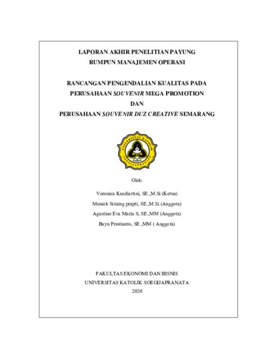 KUSDIARTINI, VERONICA and PRAPTI, MENIEK SRINING and SOEKESI, AGUSTINE EVA MARIA and PRESTIANTO, BAYU RANCANGAN PENGENDALIAN KUALITAS PADA PERUSAHAAN SOUVENIR MEGA PROMOTIONS SEMARANG. Project Report. Fakultas Ekonomi dan Bisnis Unika Soegijapranata. (Unpublished)