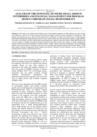 HASTUTI, THERESIA DWI and LAKO, ANDREAS and KRISPRANTONO, KRISPRANTONO and SIHOMBING, RANTO .P ANALYSIS OF THE POTENTIAL OF MICRO SMALL MEDIUM ENTERPRISES AND FINANCIAL MANAGEMENT FOR PROGRAM DESIGN CORPORATE SOCIAL RESPONSIBILITY. International Journal of Management and Applied Science, 3 (12). ISSN 2394-7926