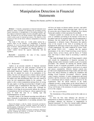 HASTUTI, THERESIA DWI Manipulation Detection in Financial Statements. International Journal of Humanities and Management Sciences (IJHMS), 3 (2). ISSN 2320–4044 (Online)