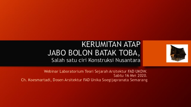 KOESMARTADI, CHRISTOPHORUS KERUMITAN ATAP RUMA JABU BOLON BATAK TOBA SALAH SATU CIRI KONSTRUKSI NUSANTARA. Webinar Membedah-Membahas Karya. (Unpublished)