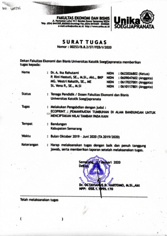 Rahutami, Angelina Ika and Hastuti, Rini and Kekalih, Westri and PURNAMASARI, VENA (2020) ECOPRINT: PEMANFAATAN TUMBUHAN DI ALAM BANDUNGAN UNTUK MENCIPTAKAN NILAI TAMBAH PADA KAIN. Unika Soegijapranata.