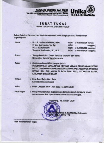 Wibowo, B. Junianto and SUPRIYANTO, IGNATIUS and Rahutami, Angelina Ika and KUSDIARTINI, VERONICA (2020) PENGEMBANGAN USAHA PETANI KENTANG MELALUI PENGENALAN PRODUK PASTEL DAN DONAT BERBAHAN DASAR KENTANG PADA KELOMPOK TANI BUMI LESTARI DAN GIRI MULYO DI DESA BUMI REJO, KECAMATAN BATUR, KABUPATEN BANJARNEGARA. Unika Soegijapranata.