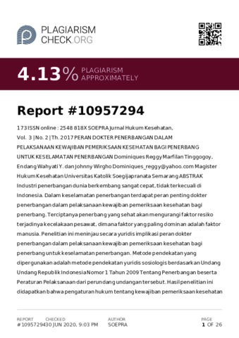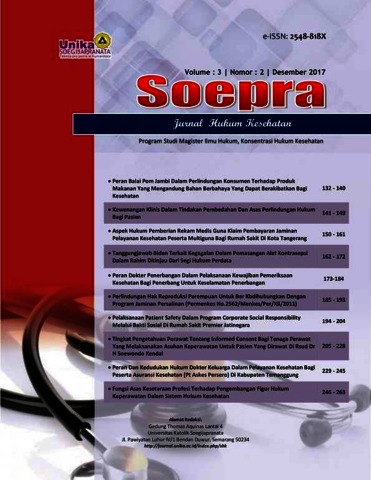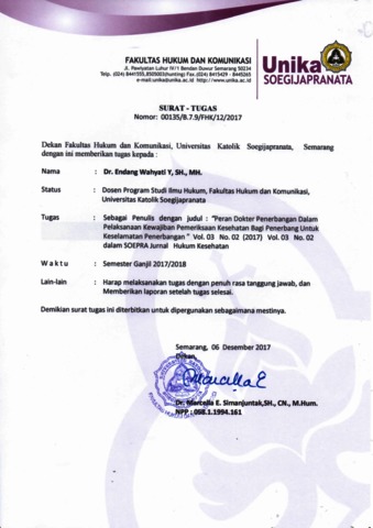 Tinggogoy, Dominiques Reggy Marfilan and YUSTINA, ENDANG WAHYATI and Wirgho, Johnny (2017) PERAN DOKTER PENERBANGAN DALAM PELAKSANAAN KEWAJIBAN PEMERIKSAAN KESEHATAN BAGI PENERBANG UNTUK KESELAMATAN PENERBANGAN. SOEPRA Jurnal Hukum Kesehatan, 3 (2). pp. 173-184. ISSN 2548-818X (media online)