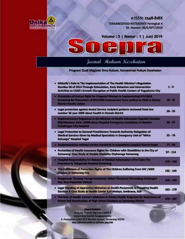 Fadhillah, Harif and YUSTINA, ENDANG WAHYATI and SARWO, YOHANES BUDI (2019) Pengaturan Tentang Tenaga Kesehatan Dalam Peraturan Perundang-Undangan Dan Azas Kepastian Hukum. SOEPRA Jurnal Hukum Kesehatan, 5 (1). pp. 146-162. ISSN 2548-818X (media online)