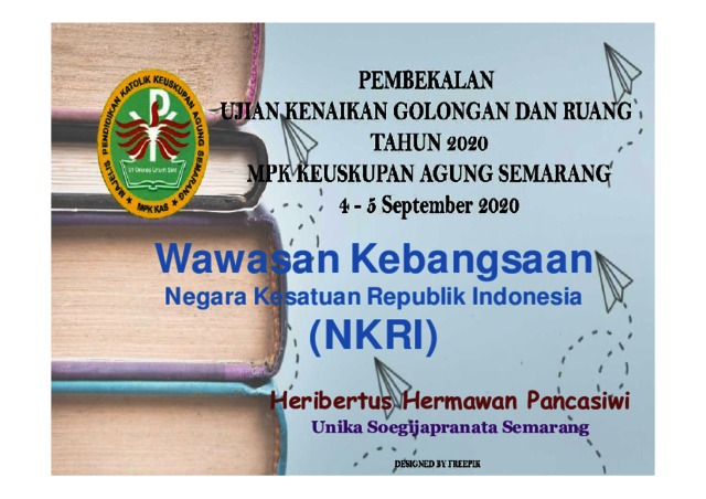 Pancasiwi, Heribertus Hermawan Wawasan Kebangsaan Negara Kesatuan Republik Indonesia. In: Ujian Kenaikan Golongan dan Ruang Tahun 2020 MPK Keuskupan Agung Semarang, 4-5 September 2020, Semarang. (Unpublished)