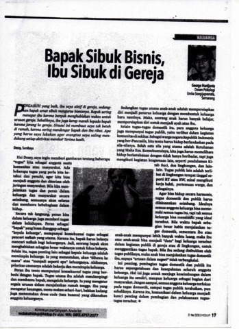 Hardjanta, George (2020) Bapak Sibuk Bisnis, Ibu Sibuk di Gereja. Majalah Hidup (22). p. 17. ISSN 0376-6330