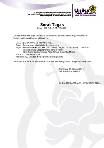Dra. Maria Yang Roswita, MSi, ita and Dra. Emiliana Primastuti, MSi, ima Surat Tugas call Abstract and Poster dalam Rangka Lustrum ketujuh Fakultas Psikologi Unika Soegijapranata. Fakultas Psikologi Unika Soegijapranata. (Unpublished)