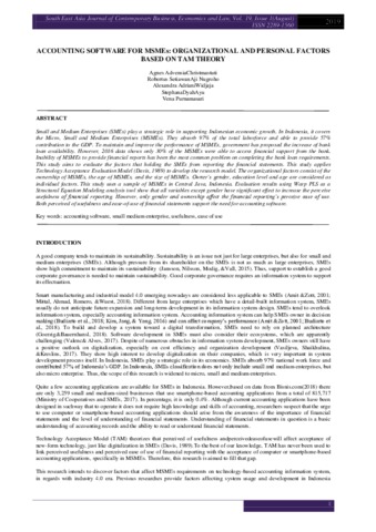 CHRISMASTUTI, AGNES ADVENSIA and Nugroho, Robertus Setyawan Aji and Adriani, Alexandra and PURNAMASARI, VENA and RATNANINGSIH, STEPHANA DYAH AYU (2019) ACCOUNTING SOFTWARE FOR MSMEs: ORGANIZATIONAL AND PERSONAL FACTORS BASED ON TAM THEORY. South East Asia Journal of Contemporary Business, Economics and Law, 19 (1). pp. 1-7. ISSN 2289-1560