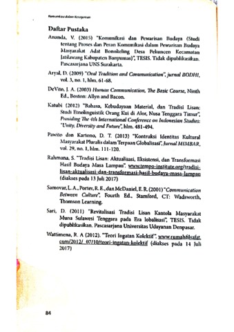 PERMATASARI, VINCENTIA ANANDA ARUM (2017) GENDHU GENDHU RASA: TRADISI LISAN MASYARAKAT ADAT BONOKELING. In: Komunikasi dalam Keragaman. Buku Litera, Yogyakarta, pp. 77-84. ISBN 978-602-6751-82-9