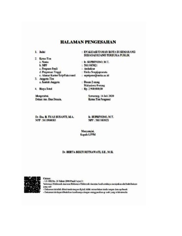 SUPRIYONO, . and SARASWATI, RATIH DIAN and YEMIMA, KEZIA EVALUASI TAMAN KOTA DI SEMARANG SEBAGAI RUANG TERBUKA PUBLIK. Project Report. --. (Unpublished)