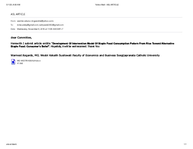 SUSILOWATI, MG. WESTRI KEKALIH and KURNIASARI, WIDURI and Wahyuningdyah, Retno Yustini (2017) DEVELOPMENT OF INTERVENTION MODEL OF STAPLE FOOD CONSUMPTION PATTERN FROM RICE TOWARD ALTERNATIVE STAPLE FOOD: CONSUMER'S BELIEF. Advanced Science Letters, 23 (8). 7108 -7111. ISSN 19366612, 19367317