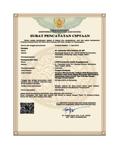 HKI (2018) Program Mikrokontroller ATMega 8535 Menggunakan Modulasi Lebar Pulsa Digital Sinusoidal Satu Panjang Gelombang untuk Inverter Tipe H-Bridge dengan Strategi Kendali Bipolar. EC00201808802.