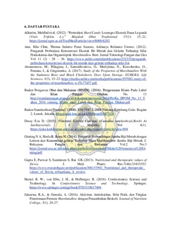 Di era sekarang ini, generasi yang lebih muda kurang mengenal minuman tradisional yaitu jamu yang memiliki banyak manfaat bagi kesehatan. Jamu merupakan minuman tradisional Indonesia yang telah diwariskan secara turun-temurun oleh nenek moyang kita. Generasi sekarang lebih menyukai produk pangan yang praktis tanpa mengutamakan kesehatan tubuh. Salah satu produk yang disukai oleh generasi sekarang yaitu marshmallow. Saat ini marshmallow yang dipasarkan, hampir keseluruhan mengandung banyak gula dan menggunakan pewarna sehingga dapat menyebabkan kegemukan. Kalori marshmallow komersil per 18 gram yaitu sebesar 60 kkal. Namun masih jarang ditemukan marshmallow dengan penambahan jamu temulawak. Marshmallow merupakan makanan ringan hasil pencampuran antara sukrosa, glukosa, gelatin, dan pewarna yang memiliki kandungan udara yang sangat tinggi sehingga dihasilkan tesktur yang lembut dan cair di mulut ketika dikunyah.Tujuan penelitian ini yaitu menemukan formulasi marshmallow reduced calorie terbaik berbasis tingkat penerimaan panelis serta membandingkan karakteristik fisiokimia. Penelitian ini diawali dengan pemilihan flavor jamu yang akan digunakan berdasarkan survey. Pemilihan ini dilakukan oleh 170 responden mahasiswa FTP dengan berbagai angkatan. Berdasarkan hasil survey, didapatkan bahwa temulawak termasuk 5 jamu yang dikenal oleh mahasiswa FTP. Dalam penelitian ini konsentrasi jamu temulawak yang digunakan yaitu 0,1%; 0,3%; dan 0,5%. Penelitian ini digunakan pula gula stevia yang dimaksudkan untuk mengklaim pengurangan kalori pada marshmallow serta komposisi gula yang digunakan setengah lebih rendah dibanding marshmallow pada penelitian lain. Marshmallow yang dihasilkan kemudian dianalisis secara fisik, kimia, dan sensori. Analisis fisik meliputi texture profile analysis dan warna. Sementara analisis kimia meliputi kadar aw, brix, dan derajat keasaman (pH). Analisis sensori dilakukan dengan menggunakan 30 orang mahasiswa FTP berbagai angkatan yang dipilih secara acak untuk menilai aspek rasa, warna, tekstur, dan keseluruhan dari marshmallow temulawak. Dari hasil penelitian pendahuluan, diketahui bahwa bentuk jamu serbuk yang dipilih sebagai bahan tambahan untuk marshmallow karena hanya mengandung serbuk murni tanpa adanya bahan tambahan lainnya. Analisis data hasil penelitian karakteristik fisikokimia menggunakan metode parametrik One Way ANOVA dengan tingkat kepercayaan 95% menggunakan uji Duncan. Selanjutnya dilakukan uji hubungan (korelasi) Pearson untuk mengetahui seberapa kuat hubungan antar variabel yang diuji karena belum ada penelitian mengenai karakterisasi marshmallow temulawak dan substitusi stevia. Analisis data hasil uji organolpetik dianalisis menggunakan metode non parametrik yaitu Kruskall Walis. Hasil penelitian menunjukkan semakin tinggi konsentrasi jamu temulawak maka semakin rendah kekerasan dan kekenyalan serta kadar gula pada marshmallow temulawak. Semakin tinggi konsentrasi jamu temulawak maka warna yang dihasilkan semakin kuning. Penambahan temulawak 0,1% menghasilkan marshmallow yang cenderung disukai panelis dalam aspek rasa, warna, tekstur, dan keseluruhan. Berdasarkan perhitungan kalori dalam marshmallow temulawak dengan substitusi stevia menghasilkan kalori sebesar 528 kkal/ 180 gram produk. Sehingga marshmallow temulawak dapat dikatakan sebagai reduced calorie marshmallow jika dibandingkan dengan marshmallow komersil.
