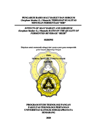 YUANARI, TERESA MUTIARA YUSSI (2020) PENGARUH RASIO MALT BARLEY DAN SORGUM (Sorghum bicolor (L.) Moench) TERHADAP KUALITAS MINUMAN FERMENTASI “BIR”. Other thesis, Unika Soegijapranata Semarang.