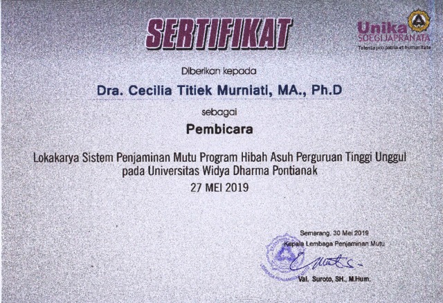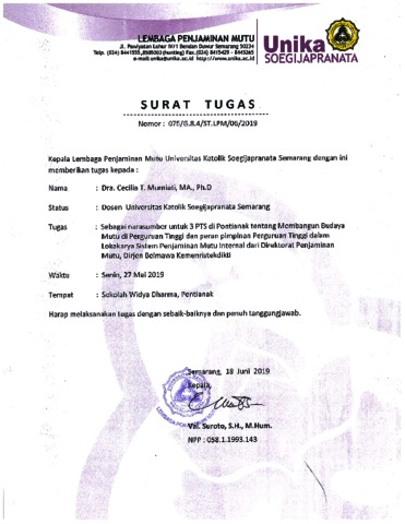 MURNIATI, CECILIA TITIEK (2019) Membangun Budaya Mutu Berbasis Regulasi. In: Sebagainarasumber untuk 3 PTS di Pontianak tentang Membangun Budaya Mutu di Perguruan Tinggi dan peran pimpinan Perguruan Tinggi dalam LokakaryaSistem Penjaminan Mutu Internal dari Direktorat Penjaminan Mutu, Dirjen Belmawa Kemenristekdikti, 27 Mei 2019, Sekolah Widya Dharma, Pontianak. (Submitted)