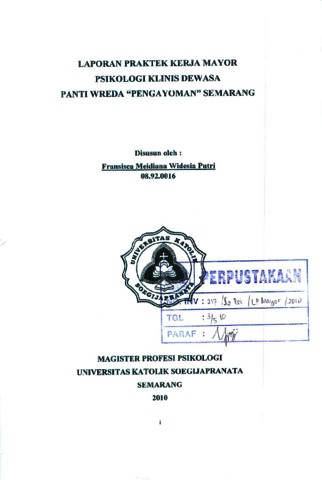 PUTRI, FRANSISCA MEIDIANA WIDESIA PUTRI (2010) LAPORAN PRAKTEK KERJA MAYOR PSIKOLOGI KLINIS DEWASA PANTI WREDA "PENGAYOMAN" SEMARANG (1). Other. Universitas Katolik Soegijapranata Semarang, Semarang. (Unpublished)