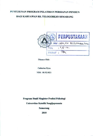 DYNA, CATHARINA (2010) PENYUSUNAN PROGRAM PELATIHAN PERSIAPAN PENSIUN BAGI KARYAWAN RS. TELOGOREJO SEMARANG. Other. Universitas Katolik Soegijapranata Semarang, Semarang. (Unpublished)
