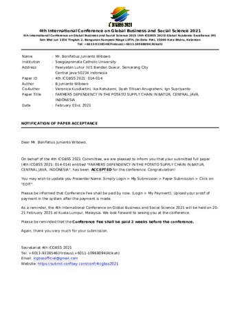 WIBOWO, BONIFATIUS JUNIANTO and KUSDIARTINI, VERONICA and Rahutami, Angelina Ika and Anugraheni, Dyah Titisari FARMERS DEPENDENCY IN THE POTATO SUPPLY CHAIN IN BATUR, CENTRAL JAVA, INDONESIA. Jurnal pada 4th International Conference on Global Business and Social Science 2021. (Submitted)