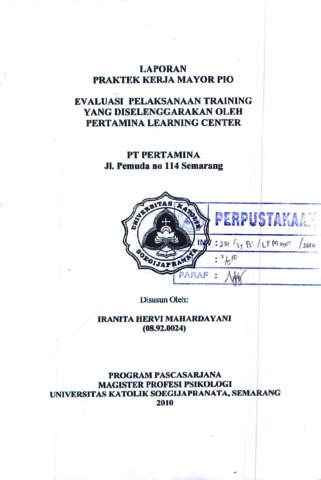 MAHARDAYANI, IRANITA HERVI (2010) LAPORAN PRAKTEK KERJA MAYOR PIO EVALUASI PELAKSANAAN TRAINING YANG DISELENGGARAKAN OLEH PERTAMINA LEARNING CENTER PT PERTAMINA JL.Pemuda no 114 Semarang. Other. Universitas Katolik Soegijapranata Semarang, Semarang. (Unpublished)