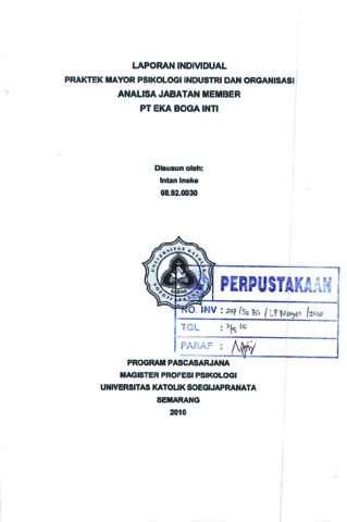INEKE, INTAN (2010) LAPORAN INDIVIDUAL PRAKTEK MAYOR PSIKOLOGI INDUSTRI DAN ORGANISASI ANALISA JABATAN MEMBER PT EKA BOGA INTI. Other. Universitas Katolik Soegijapranata Semarang, Semarang. (Unpublished)