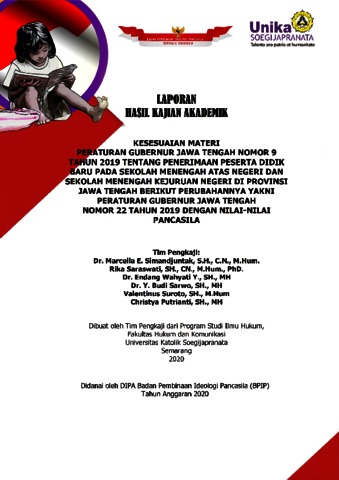 SIMANDJUNTAK, MARCELLA ELWINA and SARASWATI, RIKA and SARWO, YOHANES BUDI and WAHYATI, Y ENDANG and SUROTO, VALENTINUS and PUTRIANTI, CHRISTYA (2020) KESESUAIAN MATERI PERATURAN GUBERNUR JAWA TENGAH NOMOR 9 TAHUN 2019 TENTANG PENERIMAAN PESERTA DIDIK BARU PADA SEKOLAH MENENGAH ATAS NEGERI DAN SEKOLAH MENENGAH KEJURUAN NEGERI DI PROVINSI JAWA TENGAH BERIKUT PERUBAHANNYA YAKNI PERATURAN GUBERNUR JAWA TENGAH NOMOR 22 TAHUN 2019 DENGAN NILAI-NILAI PANCASILA. Project Report. Faculty of Law and Communication - BPIP RI, Semarang. (Unpublished)