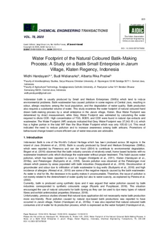 Handayani, widhi and Widianarko, Budi and Pratiwi, Alberta Rika (2020) Water Footprint of the Natural Coloured Batik-Making Process: A Study on a Batik Small Enterprise in Jarum Village, Klaten Regency, Indonesia. Water Footprint of the Natural Coloured Batik-Making Process: A Study on a Batik Small Enterprise in Jarum Village, Klaten Regency, Indonesia, 78. pp. 223-228. ISSN 22839216