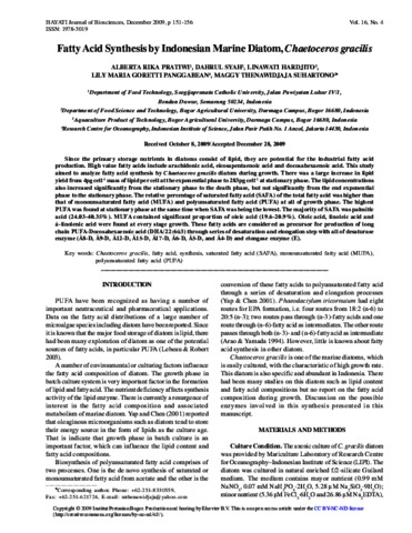 Pratiwi, Alberta Rika and Syah, Dahrul and Hardjito, Linawati and Panggabean, Lily Maria Goretti and SUHARTONO, MAGGY THENAWIDJAJA (2009) Fatty Acid Synthesis by Indonesian Marine Diatom, Chaetoceros gracilis. Fatty Acid Synthesis by Indonesian Marine Diatom, Chaetoceros gracilis, 16 (4). pp. 151-156. ISSN 2086-4094