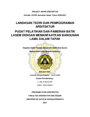 Prasetia, Andreas Wijaya (2021) PUSAT PELATIHAN DAN PAMERAN BATIK LASEM DENGAN MEMANFAATKAN BANGUNAN LAMA DALAM TAPAK. Other thesis, Universitas Katholik Soegijapranata Semarang.