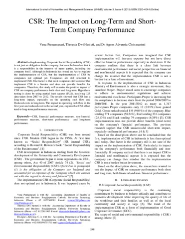 Vena Purnamasari, Vena and Theresia Dwi Hastuti, Theresia and Agnes Advensia Chrismastuti, Vivin (2015) CSR: The Impact on Long-Term and ShortTerm Company Performance. CSR: The Impact on Long-Term and ShortTerm Company Performance, 3 (4). pp. 248-252. ISSN 2320–4044