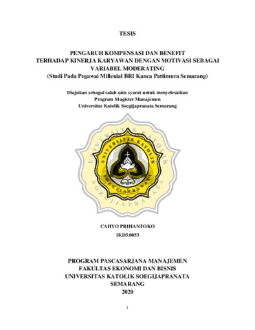 PRIHANTOKO, CAHYO (2021) PENGARUH KOMPENSASI DAN BENEFIT TERHADAP KINERJA KARYAWAN DENGAN MOTIVASI SEBAGAI VARIABEL MODERATING (Studi Pada Pegawai Millenial BRI Kanca Pattimura Semarang. Masters thesis, Universitas Katholik Soegijapranata Semarang.
