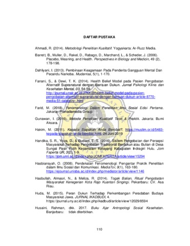 Penelitian ini bertujuan untuk memahami sebuah fenomena berobat di paranormal ditinjau dari teori Health Belief Model. Subjek pada penelitian ini berjumlah tiga orang yang berasal dari Jawa Tengah dan dikategorikan bisa mengambil keputusan berobat secara mandiri. Ketiga subjek merupakan orang-orang yang sudah pernah melakukan pengobatan di paranormal lebih dari tiga kali dengan berbagai macam metode. Proses pengambilan data pada penelitian ini berlokasi di Kota Solo, Jawa Tengah dengan menggunakan metode pengumpulan data menggunakan wawancara mendalam dan observasi. Teknik analisis data menggunakan sudut pandang fenomenologi. Hasil penelitian ini menunjukkan bahwa persepsi individu yang berobat di paranormal berawal dari kepercayaan mereka terhadap penyakit aneh yang mereka alami. Latar belakang budaya dan pengalaman sebelumnya yang pernah dialami mempengaruhi persepsi individu dalam berobat ke paranormal. Ada beberapa faktor yang menjadi alasan untuk melakukan pengobatan ke dukun yaitu; dukungan keluarga, pengalaman pribadi, efektif untuk segala macam penyakit, metode pengobatan yang sederhana dan kesembuhan yang cepat. Adanya peran dari efek sugesti dari pemberian plasebo menjadi kunci keberhasilan pengobatan. Selain itu, terbentuknya Remembered Wellness berupa kepercayaan diri, kepercayaan terhadap paranormal dan kepercayaan antara individu dengan paranormal juga mempengaruhi keberhasilan pengobatan