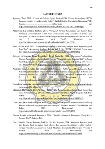 Perkembangan aktivitas di Bursa Efek Indonesia kini berkembang pesat dan berdampak pada peningkatan permintaan audit laporan keuangan secara efektif dan efisien. Setiap perusahaan yang go public diwajibkan untuk menyampaikan laporan keuangan yang disusun sesuai dengan standar akuntansi keuangan dan telah diaudit oleh akuntan publik yang terdaftar di Badan Pengawas Pasar Modal. Tingginya tingkat keterlambatan perusahaan dalam mempublikasikan laporan auditnya menjadi alasan perlunya dilakukan penelitian terhadap faktor-faktor yang mempengaruhi keterlambatan itu. Penelitian ini bertujuan untuk menganalisis faktor-faktor yang mempengaruhi audit report lag seperti audit tenure, ukuran komite audit, kepemilikan institusional, dewan komisaris independen dan fee audit, dengan menggunakan variabel kontrol yaitu solvabilitas, ukuran perusahaan dan kompleksitas perusahaan. Pengambilan sample dengan purposive sampling dilakukan pada perusahaan yang sahamnya terdaftar di Bursa Efek Indonesia pada periode 2013 - 2017 dengan total sampel 215 data, dan memiliki laporan keuangan dengan tahun buku 31 Desember. Teknik analisis data adalah analisis regresi linear berganda. Hasil penelitian adalah ukuran komite audit, kepemilikan institusional dan dewan komisaris independen berpengaruh negatif terhadap audit report lag. Sedangkan audit tenure dan fee audit tidak berpengaruh terhadap audit report lag. Variabel kontrol solvabilitas dan kompleksitas perusahaan memiliki pengaruh terhadap audit report lag, sedangkan ukuran perusahaan tidak memiliki pengaruh terhadap audit report lag.