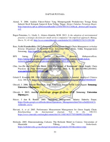 Penelitian ini bertujuan untuk mengetahui pengaruh pengetahaun lingkungan terhadap economic transport. Mengetahui corporate environment policy, packaging waste, economic transport , product recycling terhadap green capability. Mengetahui pengaruh green capability terhadap economic performance. Mengetahui pengaruh green capability terhadap environmental performance. Penelitian ini menggunakan metode purposive judgement sampling. Judgement sampling (purposive sampling) adalah teknik penarikan sampel yang dilakukan berdasarkan karakteristik yang ditetapkan terhadap elemen populasi target yang disesuaikan dengan tujuan atau masalah penelitian. Sampel yang digunakan pada penelitian ini berjumlah 70 restoran yang ada di Semarang. Penelitian ini memiiki motivasi yang yang terdapat dua sisi yang berbeda pada penelitian yang dilakukan oleh Bara (2017) yang menjelaskan bahwa tidak ada pengaruh greeen capability pada latar belakang yang terjadi. Alasan ditambahkannya tingkat pendidikan adalah karena tidak merata nya jawaban responden dari penelitian terdahulu tersebut untuk tingkat pendidikan. Hasil analisis dari penelitian ini adalah Pendidikan berpengaruh positif rerhadap economic transport. Corporate environment policy tidak berpengaruh terhadap green capability. Packaging waste berpengaruh positif terhadap green capability. Economic transport berpengaruh positif terhadap green capability. Product recycling berpengaruh positif terhadap green capability. Green capability berpengaruh positif terhadap economic performance. Green capability berpengaruh positif terhadap environmental performance.