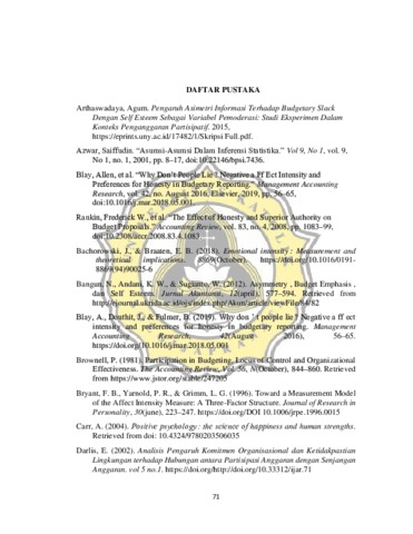 Elemen dalam organisasi yang cukup penting untuk diperhatikan dalam sebuah organisasi adalah anggaran. Penyusunan anggaran yang dilakukan dalam sebuah organisasi seringkali dilakukan dengan cara yang melibatkan partisipasi dari seluruh anggota dalam perusahaan disebut dengan anggaran partisipatif. Seringkali hal ini dimanfaatkan oleh bawahan yang dapat menyebabkan terjadinya kesalahan dalam pelaporan anggaran, salah satunya adalah terciptanya kesenjangan (slack) anggaran. Mengingat akibat buruk dari terjadinya kesenjangan anggaran, maka penelitian sebelumnya mengungkapkan bahwa salah satu faktor terjadinya kesenjangan anggaran adalah asimetri informasi. Setiap perusahaan menginginkan setiap anggotanya untuk menaati norma kejujuran, khususnya dalam proses penyusunan anggaran partisipatif dan intensitas emosi negatif diduga mampu memprediksi kejujuran. Tujuan dari penelitian ini adalah untuk menguji pengaruh asimetri informasi terhadap kejujuran dan membuktikan pengaruh intensitas pengaruh moderasi. Dalam penelitian ini, kami menggunakan asimetri informasi sebagai variabel kontrol. Partisipan penelitian adalah 97 mahasiswa S1 akuntansi yang mengikuti mata kuliah akuntansi manajemen pada tahun 2017, 2018, dan 2019. Sumber data berupa data primer, diperoleh melalui eksperimen dan angket. Penelitian ini menggunakan uji ANOVA dan analisis regresi moderasi (MRA) untuk menganalisis data. Kemudian, hasil penelitian menunjukkan bahwa individu yang lebih jujur pada kondisi asimetri informasi rendah, dan intensitas pengaruh memperlemah hubungan asimetri informasi dan kejujuran, tetapi pengaruh positif lebih kuat daripada pengaruh negatif. Temuan dalam penelitian ini memberikan dukungan yang digunakan bagi perusahaan agar berhati-hati agar tidak menciptakan kondisi asimetri informasi yang dapat menyebabkan bertambahnya individu menjadi tidak jujur.