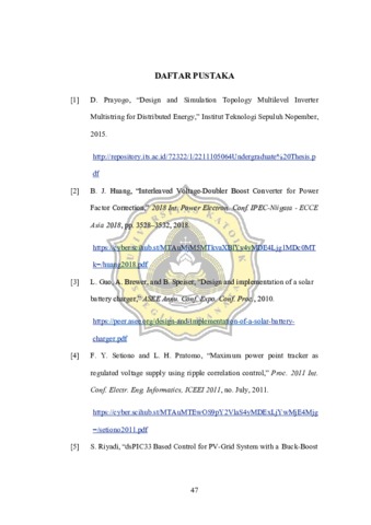 Photovoltaic (PV) merupakan alat yang penting dan utama dalam aplikasi pembangkit listrik tenaga surya (PLTS). Untuk mendapatkan kinerja maksimal dari PV diperlukan DC-DC converter beralgoritma maximum power point tracker (MPPT). Pada aplikasi PLTS lazimnya menggunakan dua buah tahap konversi : pertama DC-DC Boost Converter dan kedua multilevel inverter. Kenyataanya DCDC Boost Converter biasa diimplementasi secara tunggal sehingga mengakibatkan banyak rangkaian DC-DC Boost Converter yang harus diimplementasi. Untuk mengatasi masalah tersebut digunakanlah Boost Voltage Doubler yang bertujuan menggantikan DC-DC Boost Converter sehingga pada aplikasi PLTS hanya menggunakan 1 buah DC-DC Converter. Prinsip kerja konverter ini merupakan gabungan dua buah DC-DC Converter konvensional yang diintegrasi menjadi satu, sehingga dari bentuk rangkaian daya dan kontrol akan lebih sederhana. MPPT Boost Voltage Doubler divalidasi melalu simulasi komputasi menggubakan perangkat lunak PSIM dan sebagai tahap akhir akan dilakukan implementasi perangkat keras menggunakan mikrokontroler STM32F1038CT di laboratorium. Berdasarkan simulasi memiliki nilai efisiensi 95,89% dan pada pengujian perangkat keras memiliki nilai efisiensi 74,29%.