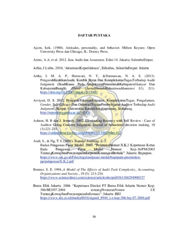 Penelitian ini bertujuan untuk mengetahui apakah akuntabilitas berpengaruh positif terhadap audit judgment. Untuk mengetahui apakah independensi berpengaruh positif terhadap audit judgment. Untuk mengetahui apakah tekanan ketaatan berpengaruh negatif terhadap audit judgment. Untuk mengetahui apakah keahlian auditor berpengaruh positif terhadap audit judgment. Hasil analisis dari penelitian ini adalah Akuntabilitas berpengruh positif terhadap audit judgment. Hasil penelitian ini mendukung penelitian yang dilakukan oleh Agustina (2010), Dini (2010), dan Consuella (2014). Independensi berpengaruh positif terhadap audit judgment. Hasil penelitian ini mendukung penelitian yang didukung oleh Mekarsari (2014), Consuella (2014), dan Widyanintyas (2019). Tekanan ketaatan tidak berpengaruh terhadap audit judgment. Hasil penelitian ini mendukung penelitian yang didukung oleh Consuella (2014), Mekarsari (2014), dan Widyaningtyas (2019). Keahlian auditor berpengaruh positif terhadap audit judgment. Hasil penelitian ini mendukung penelitian yang didukung oleh Fitriana (2014), Drupadi (2015), dan Sari (2017).