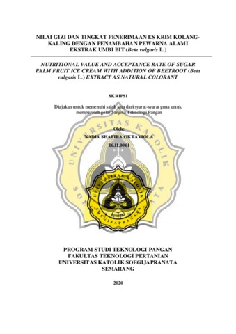 OKTAVIOLA, NADIA SHAFIRA (2020) NILAI GIZI DAN TINGKAT PENERIMAAN ES KRIM KOLANGKALING DENGAN PENAMBAHAN PEWARNA ALAMI EKSTRAK UMBI BIT (Beta vulgaris L.). Other thesis, UNIKA SOEGIJAPRANATA SEMARANG.