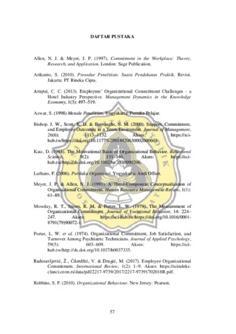 Penelitian ini bewrtujuan untuk mendeskripsikan persepsi responden mengenai komitmen organisasional pada karyawan Pudam Tirta Ampera Boyolali, upaya yang dialkukan oleh karyawan dan manajemen untuk meningkatkan komitmen organisasional. Subjek penelitian sebanyak 68 orang pegawai di Kantor Pudam Tirta Ampera Boyolali. Data diperoleh menggunakan kuisioner yang kemudian dianalisis secara statistik deskriptif. Hasil penelitian adalah (1) Persepsi Responden mengenai komitmen organisasional (komitmen afektif, berkelanjutan, normatif dan keseluruhan)pada karyawan Pudam Tista Ampera Boyolali tergolong tinggi: (2) Upaya yang dialukukan oleh karyawan Pudam Tirta Ampera Boyolali untuk meningkatkan komitmen organisasional menjaga sikap dan perilaku , serta peraturan yang ada : dan (3) Upaya yang dialkukan oleh pihak manajemen Pudam Tirta Ampera Boyolali untuk meningkatkan komitmen organisaskional melaksanakan sistem reward dan punishment dengan disiplin dan konsisten.