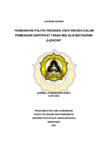 WIDYAWATI, GABRIELLA SARAS (2021) “KOMUNIKASI POLITIK PRESIDEN JOKO WIDODO DALAM PEMBAGIAN SERTIFIKAT TANAH MELALUI INSTAGRAM @JOKOWI. Other thesis, Universitas Katholik Soegijapranata Semarang.