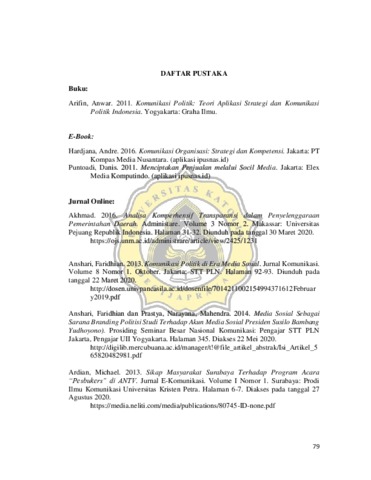 Communication is one of the important things in conveying information, especially in the world of politics. In the modern era, social media has developed into a platform for that. One example is Instagram. Instagram was chosen because it is a social media that is actively used and popular among various groups ranging from young people to adults. The government provides information about the performance of the government with videos and pictures through the Instagram account @jokowi, which is the official account of President Joko Widodo. Joko Widodo as president has a main program, namely land certificates to avoid creating conflicts in the community due to land disputes. This thesis on "Komunikasi Politik Presiden Joko Widodo dalam Pembagian Sertifikat Tanah Melalui Instagram @jokowi" aims to analyze how President Joko Widodo's interaction with the community during the process of providing information about the distribution of land certificates on his Instagram account. This study used a qualitative descriptive method by observing and studying documents on the distribution of land certificates for the period of 4 January 2016 to 23 March 2019 in the @jokowi Instagram account, as well as interviews with the public regarding the benefits of information on social media. The results of this study describe the political communication process of President Joko Widodo when the process of distributing land certificates uploaded on Instagram @jokowi is one-way communication. That is the result of no direct interaction between President Joko Widodo and the community. This happens because of President Joko Widodo, as the political communication, actor does have a special team therefore not the President himself who provides information on the @jokowi Instagram account. The president's digital communication team who is officially appointed to prepare content to be uploaded on Instagram @jokowi