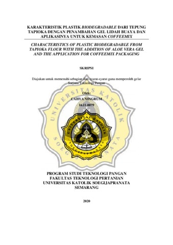 NINGRUM, CAHYA (2020) KARAKTERISTIK PLASTIK BIODEGRADABLE DARI TEPUNG TAPIOKA DENGAN PENAMBAHAN GEL LIDAH BUAYA DAN APLIKASINYA UNTUK KEMASAN COFFEEMIX. Other thesis, UNIKA SOEGIJAPRANATA SEMARANG.