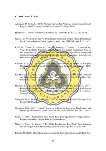 Rasa merupakan salah satu mutu dalam makanan. Hingga saat ini sudah ada 5 rasa yang diketahui yaitu manis, asin, asam, pahit, umami. Rasa umami pertama kali ditemukan ketika mengisolasi asam glutamat dari rumput laut kombu. Selain asam glutamat, rasa umami juga dapat muncul dengan kehadiran senyawa monosodium glutamat (MSG), garam 5-inosin-monofosfat, 5-guanin-monofosfat, asam aspartat. Asam glutamat dan asam aspartat dapat diperoleh dari sumber alami yaitu alga. Salah satu alga yang banyak ditemukan di Indonesia yaitu alga Gracilaria sp., alga ini mengandung asam glutamate berkisar 13% dan asam aspartatnya mencapai 12% dari total asam aminonya. Kedua senyawa ini dapat dimanfaatkan dalam pembuatan bumbu penyedap rasa. Namun alga harus melalui diekstrak agar memecah ikatan glutamat dengan protein karena glutamate yang masih berikatan dengan asam amino lain sebagai protein tidak akan memberikan rasa gurih. Dalam pembuatan bumbu penyedap rasa, diperlukan komponen lain seperti garam, gula, merica. Komponen lain ini diduga berpengaruh terhadap rasa umami bumbu penyedap rasa. Agar mengetahui pengaruh komponen lain, maka dilakukan pengujian analisi sensori dengan omission test. Metode omission test merupakan metode penghilangan suatu senyawa atau sekelompok senyawa untuk mengetahui pengaruh senyawa tersebut terhadap sensori. Tujuan dari penelitian ini untuk mengetahui komponen yang dapat mempengaruhi rasa umami pada bumbu penyedap rasa berbasis seaweed Gracilariopsis longissima (S.G.Gmelin) Steentoft, L.M.Irvine & Farnham. Proses pembuatan bumbu dilakukan dengan mengekstrak seaweed hingga diperoleh ekstrak seaweed kental. Tahap selanjutnya yaitu formulasi bumbu penyedap dengan metode omission test. Pada penelitian ini, omission test dilakukan dengan 3 tahapan. Tahap 1 dilakukan dengan menghilangkan satu komponen secara bergantian pada bumbu penyedap rasa sehingga diperoleh. Tahap ke-2 formulasi akan dihilangkan 2 komponen secara bergantian dan tahap ke-3 dihilangkan 3 komponen dari bumbu penyedap. Setelah tahap formulasi, larutan formulasi tersebut dikeringkan dengan freeze dryer pada suhu -100°C selama 96 jam. Setelah kering dan diperoleh serbuk bumbu penyedap, masing-masing formula komposisi dilarutkan dengan air mineral dan disajikan kepada panelis. Setiap panelis akan menerima 8 komposisi yang telah dilarutkan. Panelis dapat memberikan penilaian dengan skala 0-6 dan penilaian boleh
