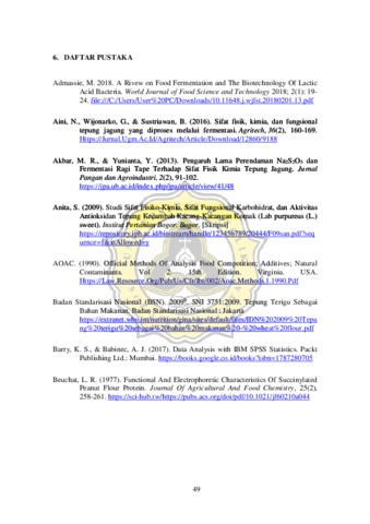Beras dibedakan menjadi beberapa kelompok berdasarkan kandungan patinya. Semakin rendah kadar amilosa atau semakin tinggi kadar amilopektin, maka semakin lekat atau pulen nasi yang dihasilkan. Selain itu beras juga bisa dibedakan berdasarkan warnanya yaitu beras putih, beras hitam, beras ketan dan beras merah. Beras merah (Oryza nivara) pada umumnya merupakan beras pecah kulit yang hanya dipisahkan bagian sekamnya (tanpa proses penyosohan) sehingga kulit arinya masih melekat pada endosperm. Adanya proses tersebut maka beras merah masih memiliki lebih banyak kandungan gizi dibandingkan dengan beras putih namun masih banyak masyarakat Indonesia yang lebih memilih mengkonsumsi beras putih dibandingkan dengan beras merah karena rasa beras putih yang lebih pulen sehingga lebih bisa diterima. Kurangnya minat masyarakat terhadap beras merah membuat pemanfaatannya dalam bidang pangan di Indonesia masih tergolong rendah. Dalam meningkatkan pengaplikasian beras merah maka dibuat salah satu bentuk olahan pangan yang paling sederhana yaitu menjadi tepung beras merah. Beras merah yang digunakan sebagai bahan baku pembuatan tepung beras merah adalah beras merah dengan varietas Inpari 24 yang diambil dari Koperasi Serba Usaha Citra Kinaraya, Desa Mlatiharjo, Kecamatan Gajah, Kabupaten Demak. Tepung konvensional memiliki daya cerna yang rendah, maka dilakukan modifikasi dengan cara fermentasi menggunakan bakteri asam laktat untuk meningkatkan karateristik kimia, dan fisik dari tepung beras merah. Bakteri asam laktat yang digunakan dalam penelitian adalah bakteri Lactobacillus pentosus LLA18 dan Lactobacillus fermentum LLB3 dengan waku fermentasi selama 24, 48, 72, 96, dan 120 jam. Tujuan dari penelitian ini adalah untuk mengetahui pengaruh lama fermentasi dan jenis bakeri asam laktat Lactobacillus pentosus LLA18 dan Lactobacillus fermentum LLB3 pada pembuatan tepung beras merah fermentasi terhadap karakteristik kimia dan fisik tepung yang dihasilkan. Tepung beras merah fermentasi yang dihasilkan kemudian dilakukan analisa secara kimia (kadar air, kadar abu, kadar protein, kadar lemak, kadar amilosa, kadar gula pereduksi dan nilai pH) serta secara fisik (densitas kamba, derajat putih, kapasias penyerapan air, kelarutan, dan swelling volume). Berdasarkan hasil analisa kimia dan fisik, dicari tepung beras merah fermentasi terbaik dan dilakukan pengujian Scanning Electronic Microscope (SEM) untuk melihat granula patinya. Pada perlakuan fermentasi menunjukkan karakteristik kimia dan fisik tepung yang lebih baik dibandingkan dengan tepng beras merah tanpa perlakuan fermentasi. Berdasarkan hasil penelitian, tepung beras merah terbaik didapatkan dengan waktu fermentasi selama 120 jam menggunakan bakteri Lactobacillus fermentum LLB3. Tepung beras merah fermentasi terbaik dari hasil penelitian ini memiliki kadar protein sebesar 18,56%; lemak 1,92%; air 7,64%; abu 0,38%; amilosa 22,50%; gula pereduksi 0,28%, nilai pH 3,6; densitas kamba 20,33 g/ml; kapasitas penyerapan air 1,06%; kelarutan 8,81%; dan sweliing volume 12,68%. Berdasarkan hasil Scanning Electronic Microscope (SEM), tepung beras merah fermentasi memiliki bentuk granula pati memisah dan tidak bergerombol, selain itu bentuknya tidak lagi memiliki bentuk bulat beraturan.