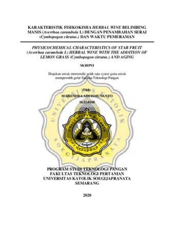 ISMUNANTO, MAHENDRA ADI (2020) KARAKTERISTIK FISIKOKIMIA HERBAL WINE BELIMBING MANIS (Averrhoa carambola L) DENGAN PENAMBAHAN SERAI (Cymbopogon citratus.) DAN WAKTU PEMERAMAN. Other thesis, UNIKA SOEGIJAPRANATA SEMARANG.