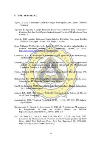 Di Indonesia pengolahan belimbing manis masih sangat terbatas dan kurang bervariasi. Sehingga perlu dilakukan inovasi pengolahan belimbing manis seperti pembuatan minuman fermentasi. Salah satu produk minuman fermentasi adalah wine. Wine pada umumnya memiliki aftertaste yang cenderung biasa dan kurang bertahan lama di mulut serta aroma yang pada sebagian orang kurang suka. Namun dengan penambahan herbal pada wine dapat meningkatkan kualitas dari aftertaste dan aroma pada wine, penambahan herbal ini bertujuan untuk mendapatkan sensasi aftertaste dan aroma yang berbeda sehingga akan memunculkan ciri khas tersendiri serai mengandung minyak atsiri, hidrokarbon penyusun utama minyak atsiri adalah terpen, terpen disini yang berperan dalam menimbulkan bau dan rasa. Pemeraman merupakan salah satu proses penting dalam pembuatan wine karena meningkatkan kualitas warna, aroma, rasa, dan aftertaste yang dirasakan di mulut saat mengkonsumsi wine Tujuan dari penelitian ini adalah untuk mengetahui formulasi terbaik rempah serai dan waktu pemeraman untuk herbal wine belimbing manis Herbal wine belimbing manis dibuat dengan penambahan herbal serai sebanyak 2 dan 4 gram/l yang diperam selama 2 dan 4 minggu dengan masing-masing 2 kali pengulangan. Sehingga dipisah menjadi empat formulasi S1 (pemeraman dua minggu dengan penambahan herbal serai 2 g/l), kemudian S2 (pemeraman dua minggu dengan penambahan herbal serai 4 g/l), S3 (pemeraman 4 minggu dengan penambahan herbal serai 2 g/l), Dan S4 (pemeraman empat minggu dengan penambahan herbal 4 g/l). Uji yang dilakukan yaitu kekeruhan, kandungan gula (brix), pH, alkohol (etanol dan metanol), aktivitas antioksidan, kadar tanin, dan total SO2 , mikrobiologi (Total Plate Count dan pewarnaan), dan uji sensori. Pengolahan data menggunakan One Way ANOVA Hasil pengujian kekeruhan uji kekeruhan tertinggi ada pada formulasi S4 dengan nilai 302,67 NTU dan yang terendah ada pada formulasi kontrol yaitu sebesar 209,67 NTU.Untuk hasil uji brix kadar gula tertinggi ada pada formulasi S1 dengan nilai 16,70 o brix, sedangkan yang terendah ada pada formulasi kontrol dengan nilai 16,23o brix. Pada uji pH didapat hasil formuladengan kadar pH tertinggi ada pada formulasi S2 dengan nilai 3,83, sedangkan yang terendah ada pada formulasi kontrol dengan nilai 3,50. Sedangkan pada uji kadar metanol dan etanol sampel dengan hasil sensori terbaik yaitu S4 dengan kadar etanol 30,38%, dan tidak didapati kandungan metanol. Sedangkan untuk pengujian kandungan antioksidan dengan kadar tertinggi ada pada formulasi S4 dengan nilai 92,07 % sedangkan yang terendah ada pada formulasi kontrol dengan nilai 89,25%. Untuk uji tanin kandungan terbesar ada pada formulasi S1 dengan nilai 6,23% sedangkan yang terendah ada pada formulasi S3 dengan nilai 4,33%. Untuk pengujian kandungan SO2 menunjukan hasil negatif untuk semua sampel. %. Pada hasil uji mikrobiologi terdapat pertumbuhan bakteri yang diduga sebagai bakteri asam asetat. Pada uji sensori paling disuka oleh panelis adalah formulasi S4 dengan pemeraman 4 minggu penambahan rempah 4g/l.