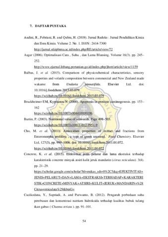 Rumput laut merupakan tanaman perairan yang sangat berpotensi sebagai salah satu sumber pangan alternatif. Rumput laut memiliki kandungan nutrisi yang tinggi, antara lain mineral, vitamin, serat tidak berkalori, dan senyawa antioksidan. Fukosantin merupakan senyawa antioksidan yang banyak diteliti di rumput laut cokelat. Fukosantin yang terkandung dalam berbagai spesies rumput laut cokelat memiliki karakteristik yang sama, namun berbeda konsentrasinya. Undaria pinnatifida merupakan spesies yang banyak dimanfaatkan sebagai bahan pangan dan dikenal dengan nama wakame. Proses pengolahan yang paling sering diaplikasikan terhadap wakame yaitu pengeringan, perebusan, dan penggaraman. Contoh pemanfaatan wakame sebagai bahan pangan yaitu sebagai chuka dan sup. Fukosantin dalam spesies Undaria pinnatifida bersifat semi polar dan proses ekstraksinya dapat dilakukan dengan menggunakan pelarut polar selain air maupun non polar. Pelarut yang sering digunakan dalam mengekstraksi fukosantin yaitu aseton, metanol, dan khloroform. Tujuan dari penelitian ini yaitu untuk mengetahui kondisi proses ekstraksi serta kandungan senyawa fukosantin dari spesies Undaria pinnatifida, mengetahui proses pengolahan Undaria pinnatifida sebagai bahan pangan, serta mengetahui manfaat kesehatan dari fukosantin yang terdapat di spesies Undaria pinnatifida. Fukosantin memiliki beberapa manfaat, seperti anti kanker, anti diabetes, anti obesitas, serta antioksidan. Penambahan fukosantin dalam konsentrasi tertentu dapat meningkatkan penurunan viabilitas sel kanker dan dapat meningkatkan intensitas relatif fragmentasi DNA sel kanker sehingga dapat mempercepat terjadinya apoptosis. Penambahan fukosantin dalam konsentrasi tertentu dapat menurunkan berat white adipose tissue yang memicu penimbunan lemak dan penyebab obesitas serta meningkatkan brown adipose tissue yang berperan sebagai anti obesitas. Selain itu, penambahan fukosantin dalam konsentrasi tertentu dapat menurunkan kadar glukosa darah sehingga dapat mengurangi risiko diabetes dan berperan sebagai anti diabetes. Penambahan fukosantin dalam konsentrasi tertentu dapat meningkatkan persen penangkapan radikal bebas sehingga fukosantin dapat berperan sebagai antioksidan alami.